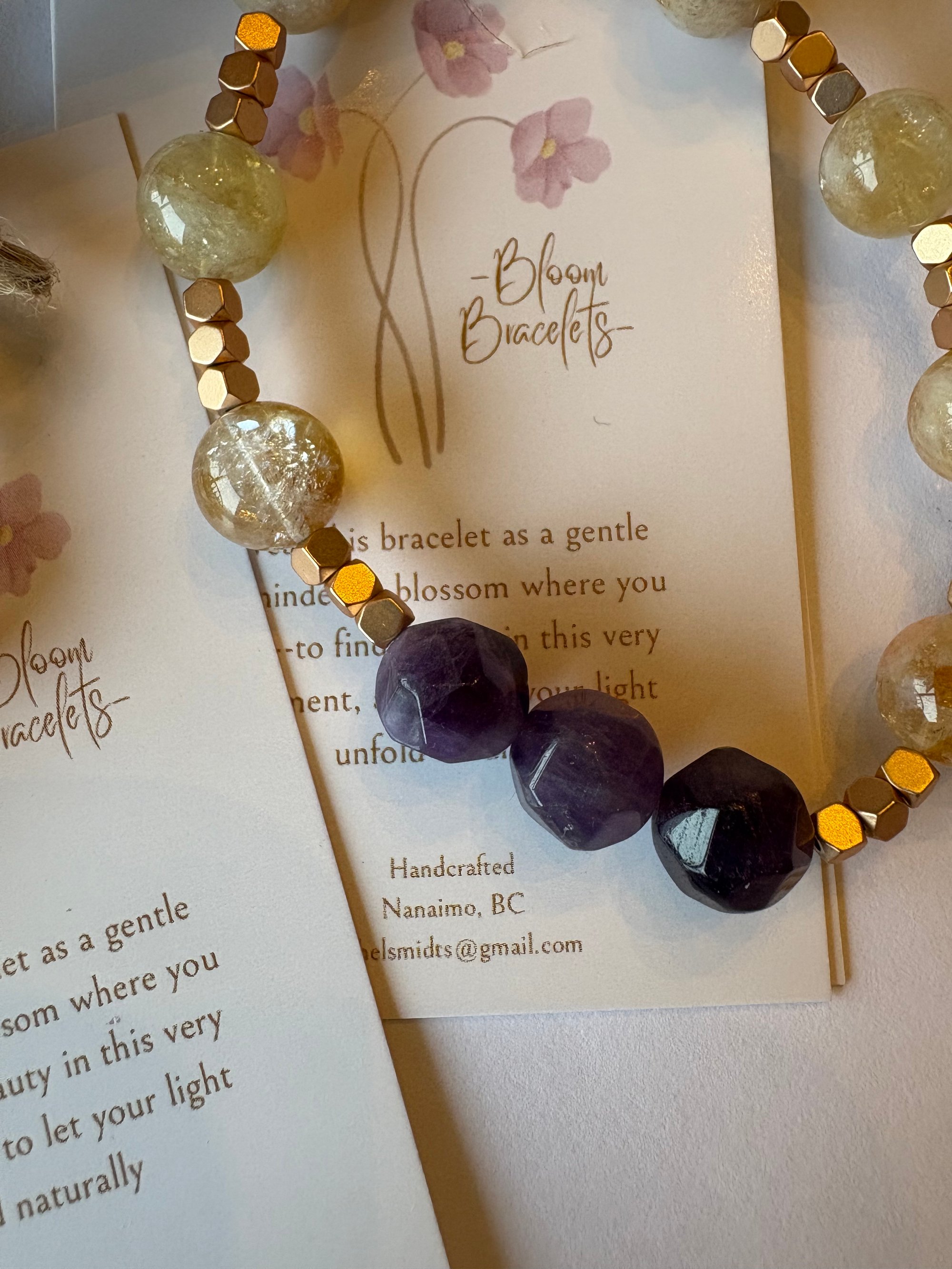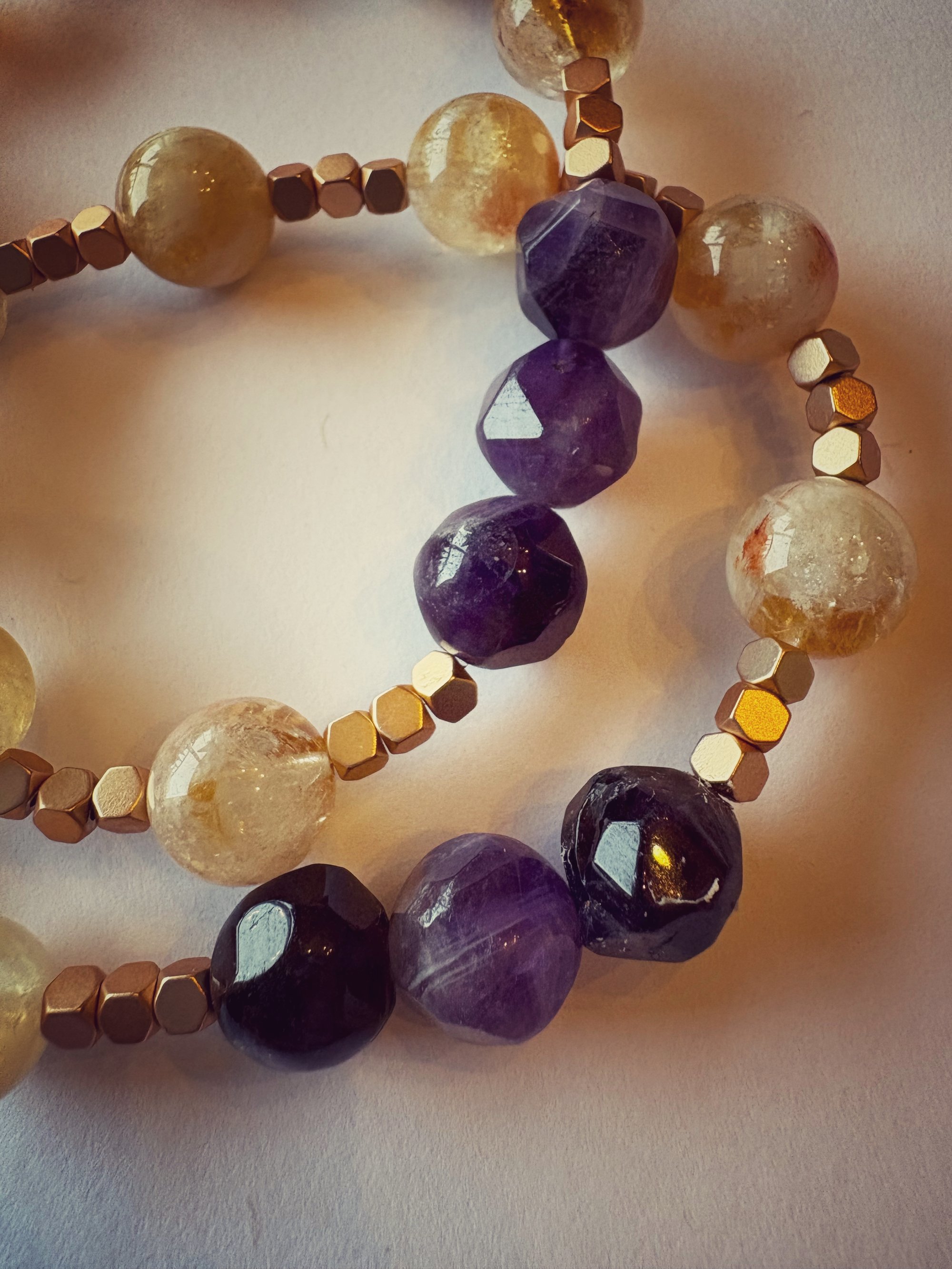 Bright, uplifting, and beautifully balanced, this handmade bracelet features a radiant blend of citrine and amethyst semi-precious beads. Each stone is carefully selected for its natural beauty—citrine bringing warm, golden clarity and amethyst adding soft, calming violet tones.
