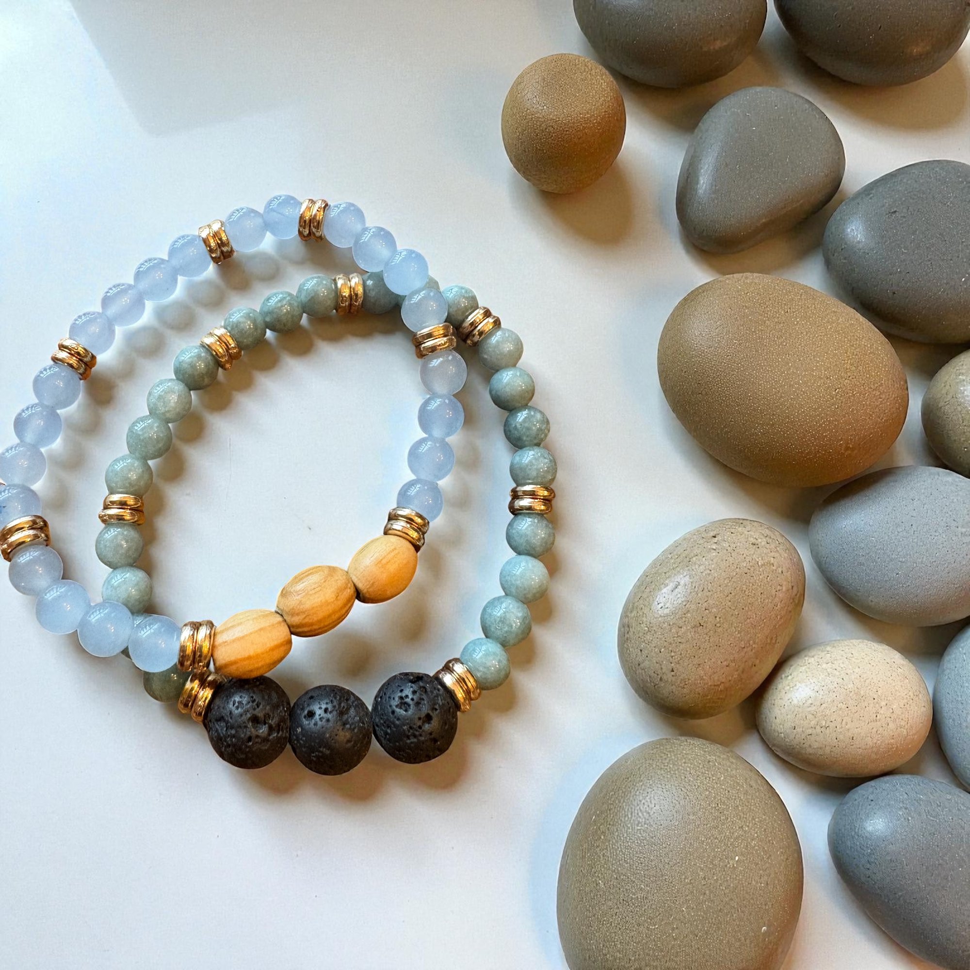 Aquamarine promotes peace, clarity, and emotional balance, while lava stone—born from raw energy—encourages grounding and renewal.