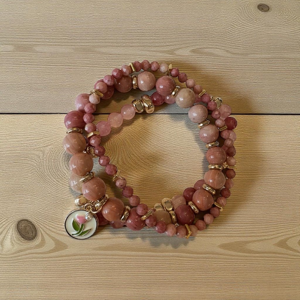 The Vintage Bloom Bracelet is a romantic trio of bracelets inspired by timeless beauty and grace. Featuring soft pink rose quartz—the stone of love and compassion—each bead radiates gentle energy and feminine charm. A delicate vintage tulip trinket adds an elegant, nostalgic touch, symbolizing perfect love and renewal. Wear these three coordinating bracelets together or separately for an effortlessly graceful look that complements any style.